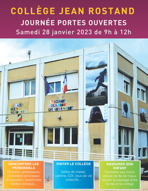 Ce samedi 28 janvier, venez rencontrer les personnels de direction, les enseignants, les conseillers principaux d'éducation... etc., et visiter les locaux du collège (salle de classe, cantine, CDI...)